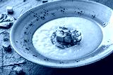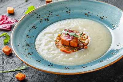 Cream soup of celery with tartare from baked vegetables decorated from croutons and arugula in plate on dark stone background. Top view, Flat lay. Vegetarian food