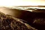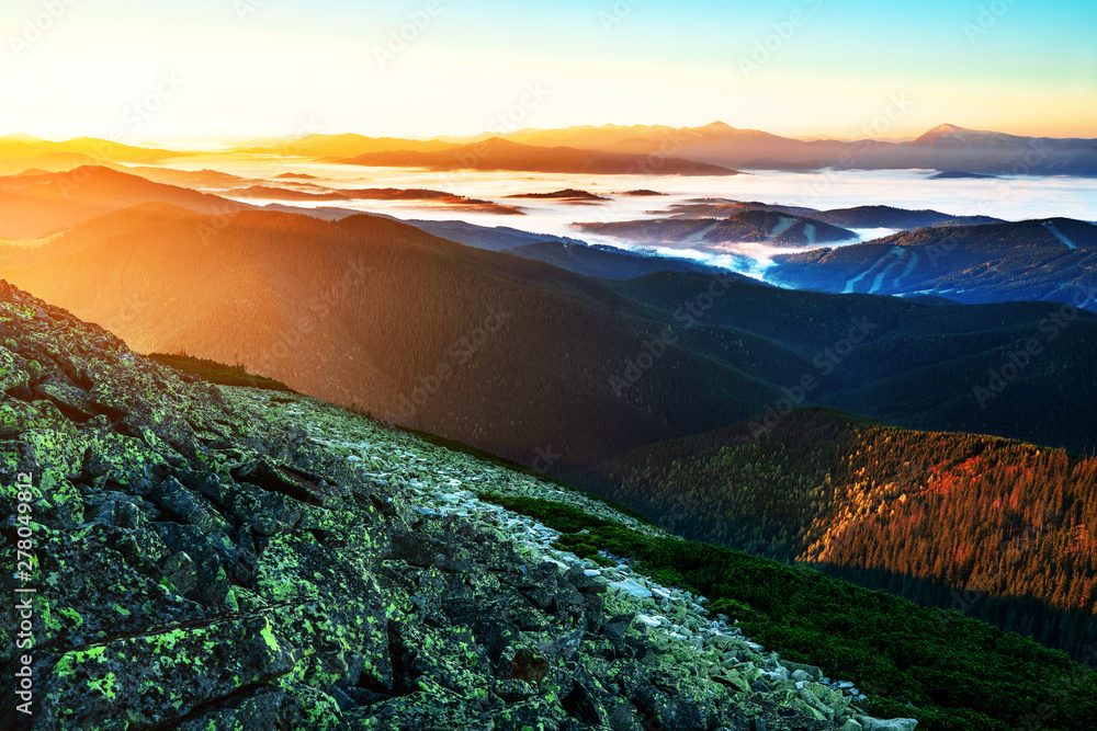 Beautiful dawn in the mountain range. Mountains shrouded in mist in a scenic landscape view. Peak of rock, top view. Location Carpathian mountains, Europe. Travel background