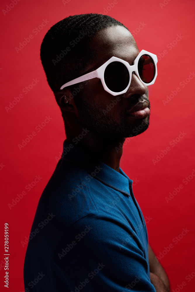 Fashion portrait of black man in sunglasses on red background