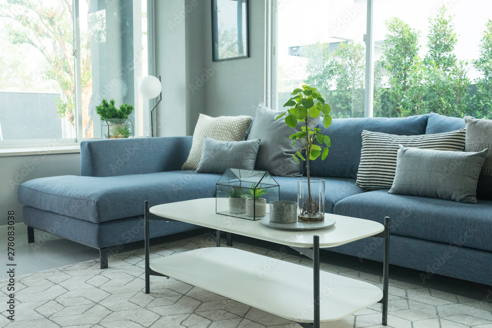 Modern and stylish living room, blue sofa and grey pillow with coffee table and floor lamp.