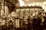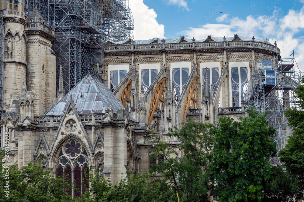 Paris, France - July 11, 2019: Notre Dame de Paris. Reinforcement work in progress after the fire. Wood Shoring now prevent the flying buttresses from collapsing.
