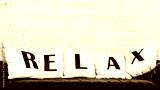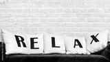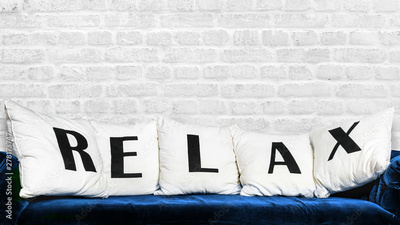 Blue sofa and white pillows with letters RELAX on brick wall background.