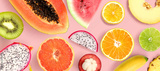 Creative layout made of papaya, grapefruit, lemon, kiwi, melon, watermelon, banana, pineapple, orange, mangosteen and flowers on pink background. Tropical flat lay. Summer fruits concept.