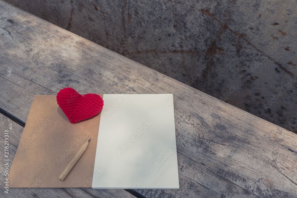 Notebook and pencil with heart on retro wooden table. Simple and minimal style for wallpaper