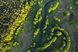 Summer green nature landscape top view. Aerial view of grassy meadow and trees.