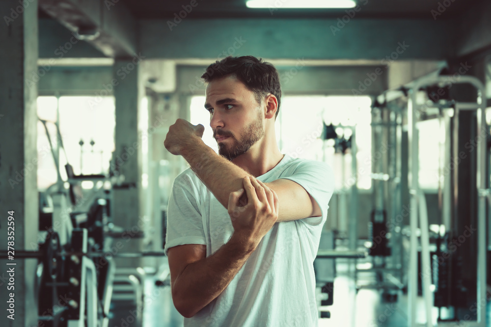 Handsome Healthy Man is Warm-Up Exercised Before Working Out in Fitness Sport Club.,Portrait of Strong Man Doing Exercising Calories Burning in Gym., Sport Healthy and Fitness Lifestyle Concept.