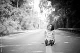 Smile asian woman sitting in the middle of the mountain road with happy and relax