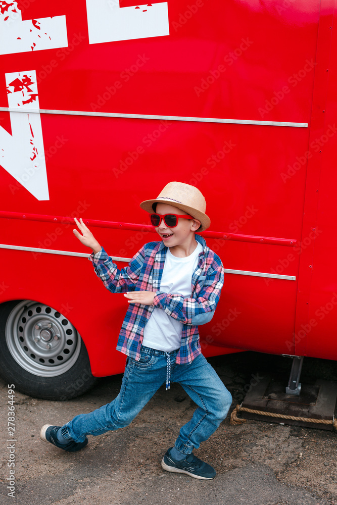 Adorable little boy in trendy clothes and red sunglasses dancing outdoor