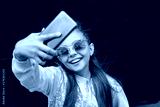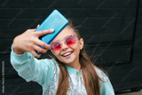 Pretty little girl in sunglasses making a selfie using a smart phone and smiling outdoor