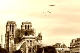 Paris, France - July 14 2019: Bastille Day Aircrafts Parade over Notre Dame de Paris while reinforcement work is in progress after the fire.