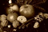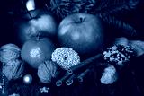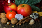Gebäck, Nüsse, Äpfel, Mandarinen und Gewürze zu Weihnachten