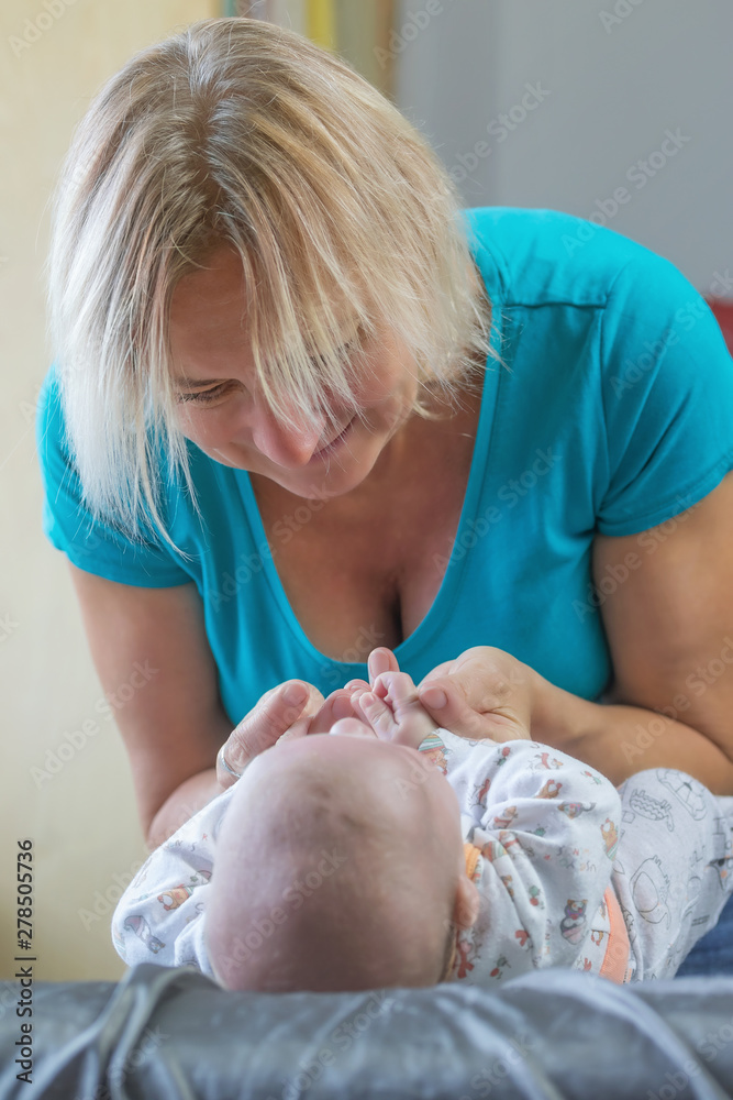 Middle aged blonde woman is playing with a lying newborn baby. Vertically.