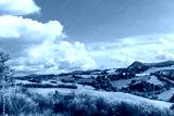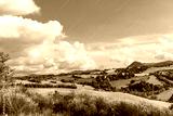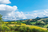 Countryside landscape, green hills and blue sky
