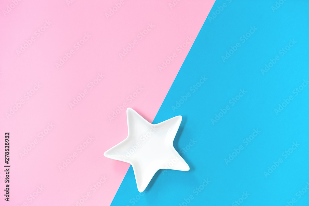 Blue nonpareils cake candy sprinkles in one white star bowls on pink blue background in flat lay with copy space. Party celebration dessert menu or bakery concept