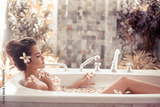 Pretty girl enjoying bath with plumeria tropical flowers. Health And Beauty. Spa Relax. Closeup Beautiful woman Bathing With Petals. Treatment, Aromatherapy Skin Body Care Therapy.