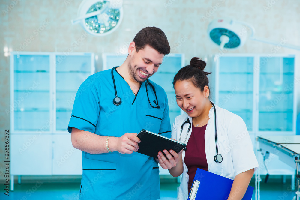 Professional team asian doctor. The staff of the medical intern. multinational people - doctor, nurse and surgeon. A group of graduates of a medical university in a surgical room.