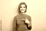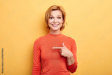cheerful gorgeous fair-haired girl dressed casually showing something with index finger. close up portrait. happiness, this way. advert concept. body language
