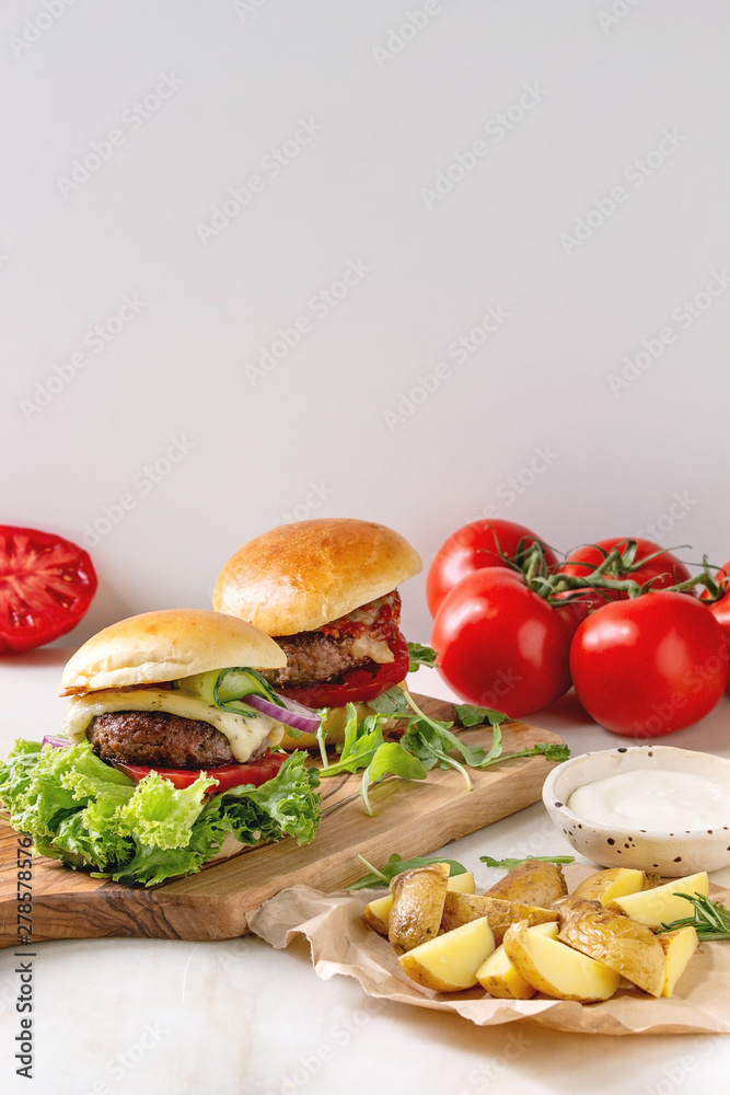 Two homemade fast food burgers classic hamburger or cheeseburger with beef, salad, cheese and tomato served on wooden cutting board with baked potato and sauce on white marble table. Copy space.