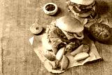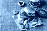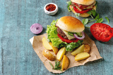 Two Homemade fast food burgers classic hamburger or cheeseburger with beef, salad, cheese and tomato served on paper with baked country potatoes and sauce on blue texture background. Copy space.