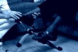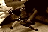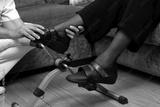 Detail of hands holding foot in stationary rehabilitation pedals.