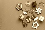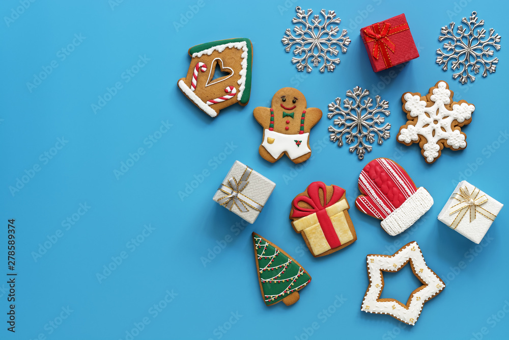 Christmas background, gingerbread and gift boxes on a blue background.View from above, flat lay, copy space.