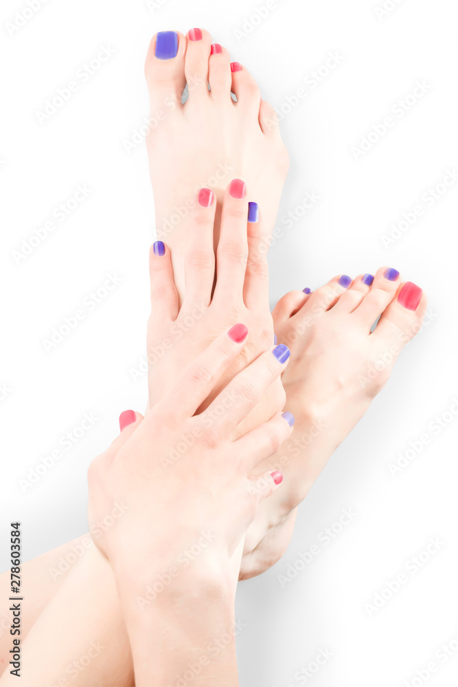 Woman hands and legs with red and blue nail polish isolated with clipping path