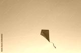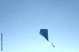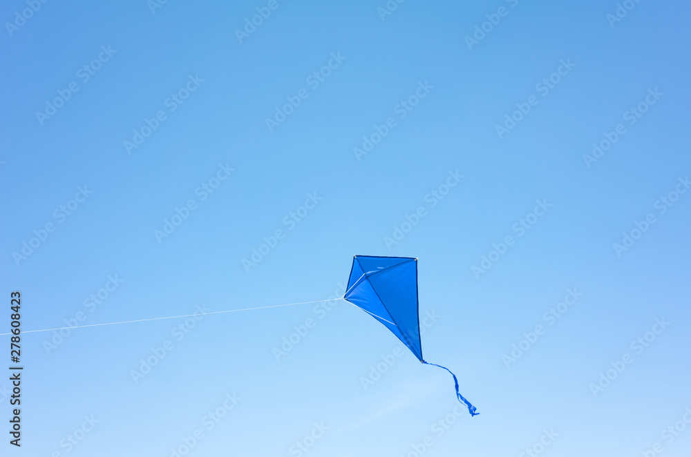 A blue kite soars in a cloudless sky. The concept of freedom, summer hobbies, entertainment in nature. Minimalism, space for text, shades of blue.