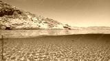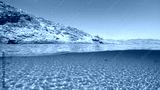 Split of above and underwater photo of iconic and beautiful small cove and sandy clear turquoise beach of Agios Sostis, Mykonos island, Greece