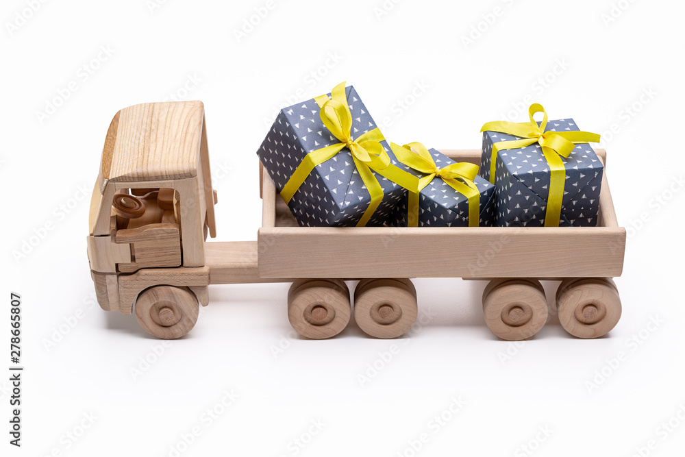 Toy wooden car with gifts. Elegant boxes with gifts in back of truck. Copy space, holiday concept. Discounts, sale.