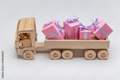 Toy wooden car with gifts. Elegant boxes with gifts in back of truck. Copy space, holiday concept. Discounts, sale.