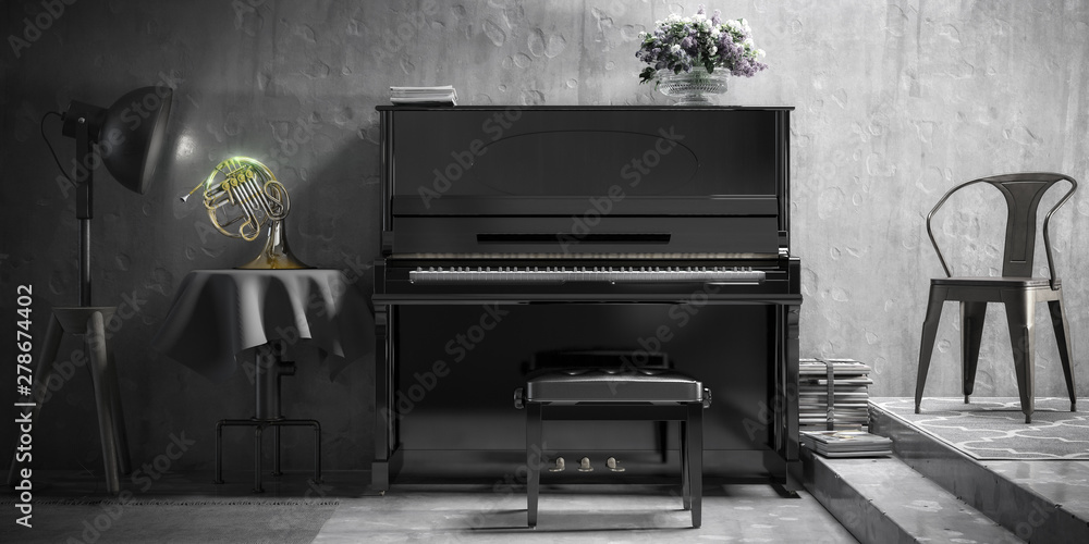 Arangment of Piano and French Horn (panoramic B&W) - 3d visualization