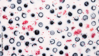 Blueberries and strawberries in milk.Wild berries with milk.Background of blueberries with milk.