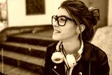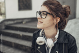Outdoor Summer Portrait of Young Beautiful Girl in Black Leather Jacket and Trendy Black Glasses
