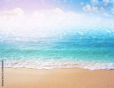 pink flamingo on beautiful sandy beach and soft blue ocean wave summer concept background