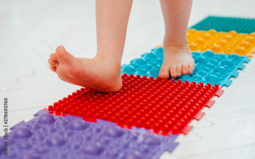 Toddler on baby foot massage mat. Exercises for legs on orthopedic massage carpet. prevention of flat feet and hallux valgus
