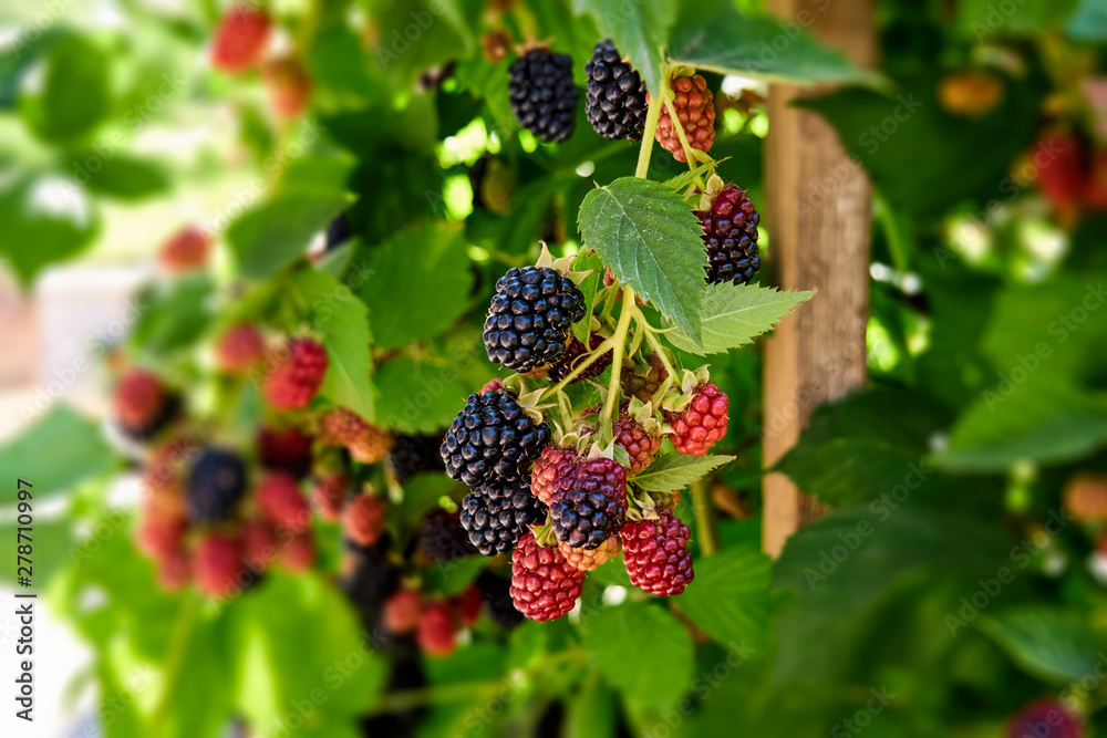Evergreen blackberry grows. Harvest during the main season. Ripe and unripe blackberries grow on the bushes. Berry background.