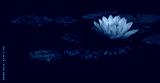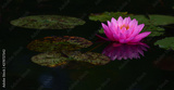 A pink glowing flower of a water lily swims on a dark lake and is reflected in the water