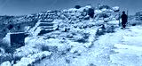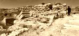 panorama of a tourist in the entrance courtyard of tel lachish ruins in Israel showing the city wall, inner gate, and official rooms