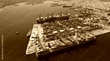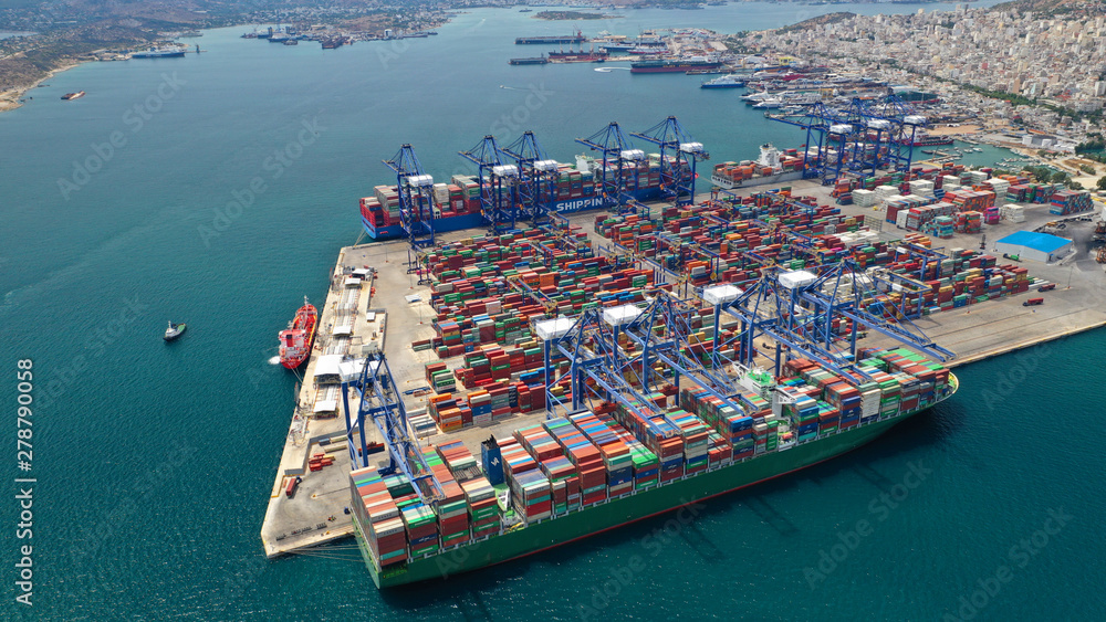 Aerial drone view of industrial cargo shipment and logistics port terminal with container trucks, ships and cranes