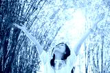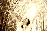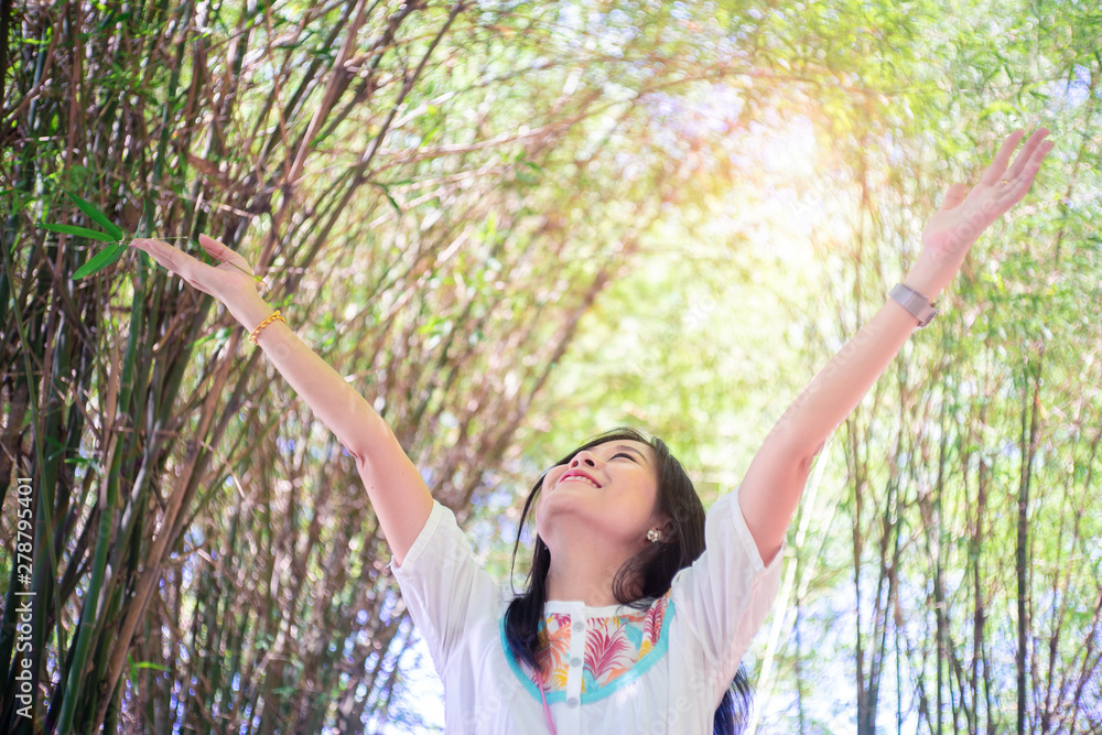 Freedom woman arms raised enjoying the fresh air in green bamboo trees.