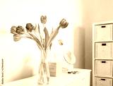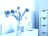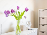 Purple tulips in glass vase on bedroon dressing table with accessories and furniture in background (selective focus)