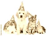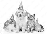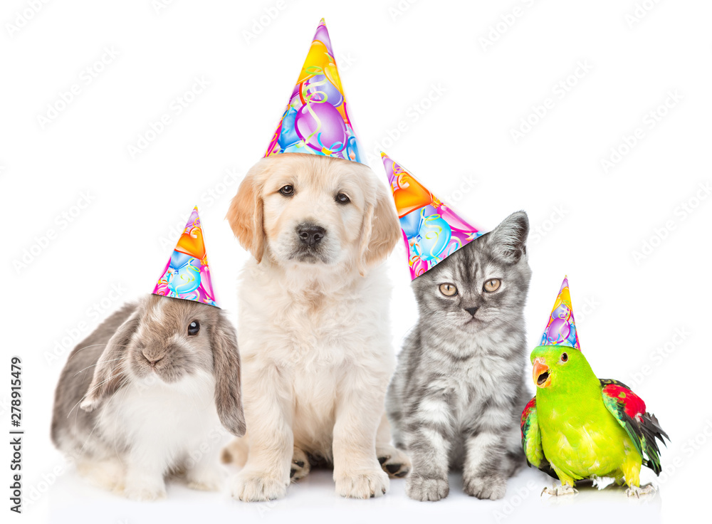 Group of pets with party hats sitting together in front view and looking at camera. Isolated on white background