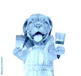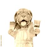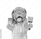 Funny puppy in blue overalls with color samples and paintbrush. isolated on white background