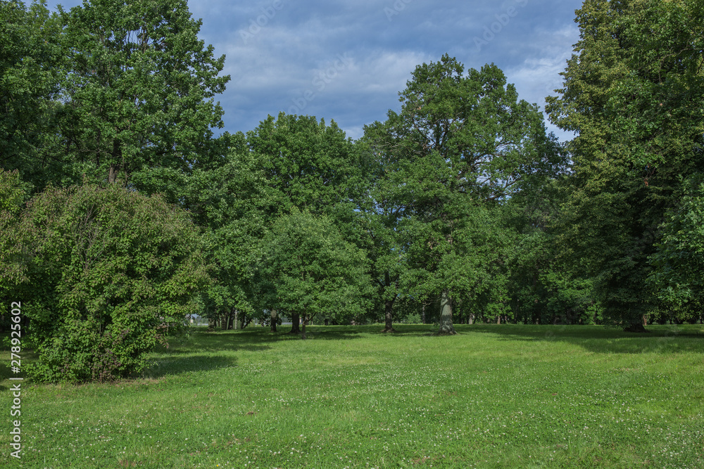 Beautiful meadow in the park, blooming place in the spring park in cloudy weather, clousy blue and white sky