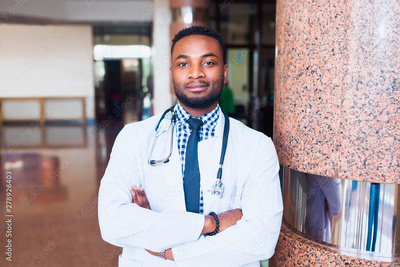 Professional African American doctor in hospital. The concept of medicine and health. Life and health insurance