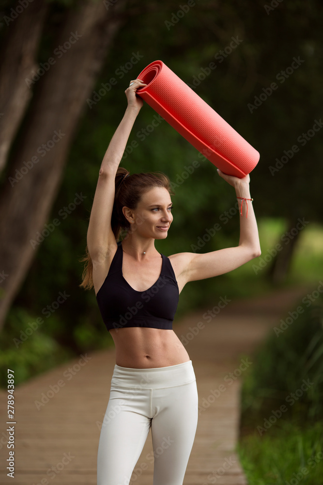 Pretty sportive girl with yoga mat outdoors in green park, summer time