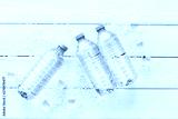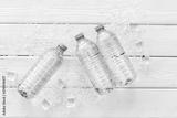 empty plastic bottles for pure water with ice cubes on white wooden background top view