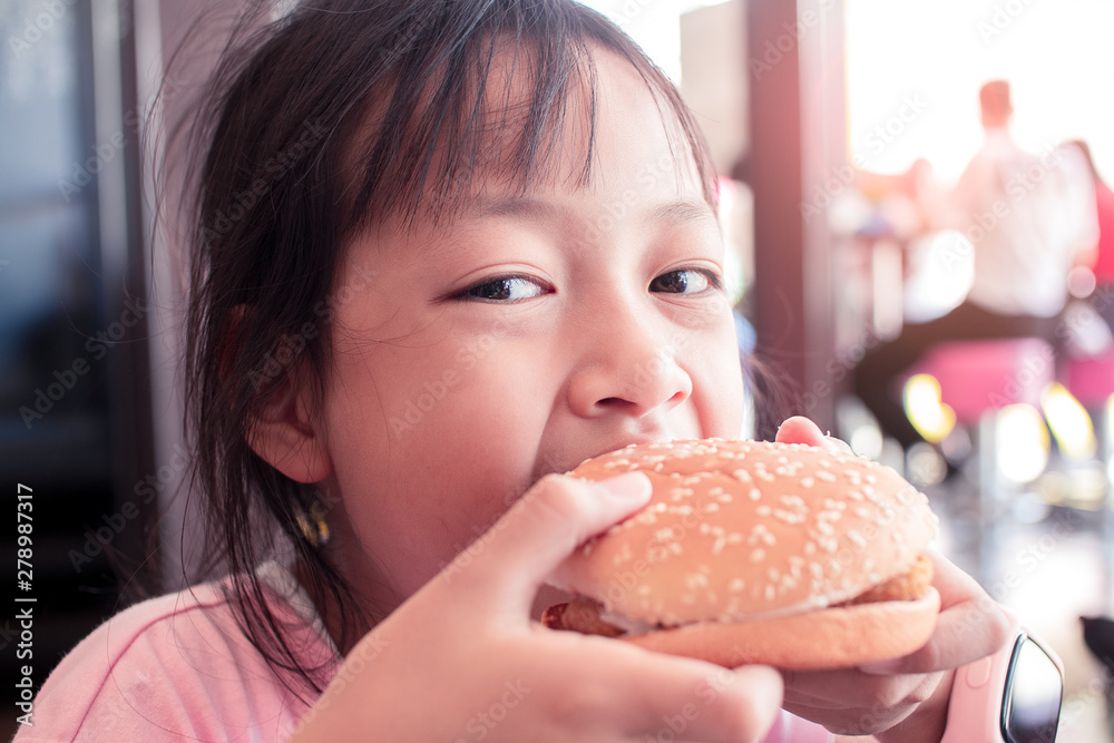 Cute asian little girl eating a hamburger in fast food restaurant.