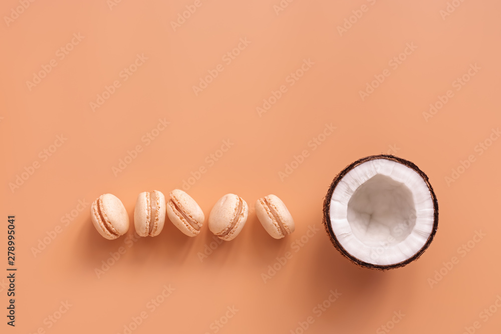 Macaroon and coconut in a row on a pastel pink or peach color background. Creative layout. Flat lay, top view, copy space.