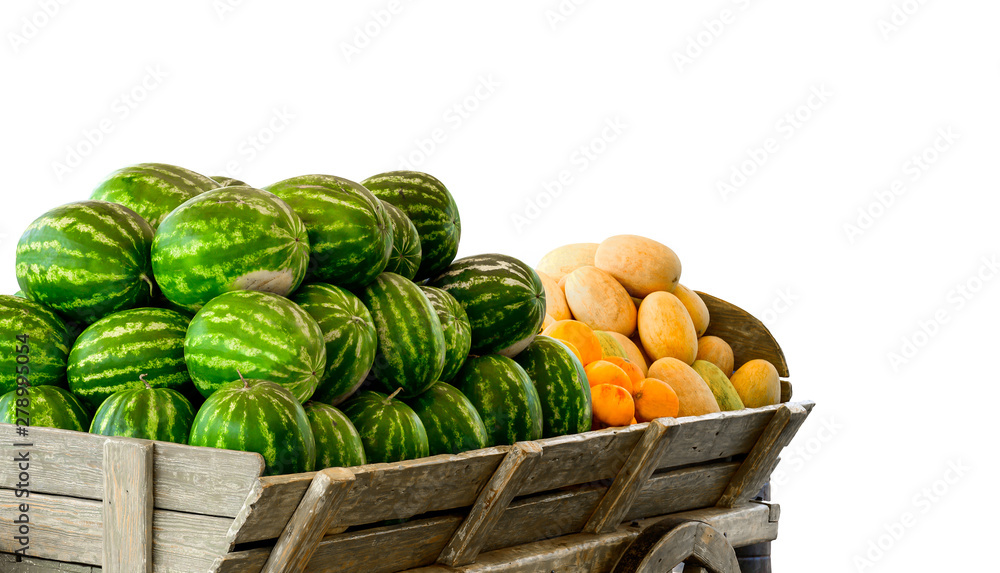 Pile of watermelons and melons isolated on white.
